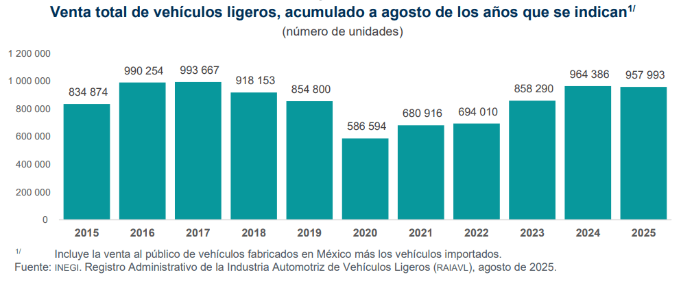 El reporte también ofrece un panorama de las ventas acumuladas en el año. Entre enero y agosto de 2025, en México se vendieron 957,993 unidades, lo que significó una caída de 0.7 % respecto al mismo periodo de 2024.